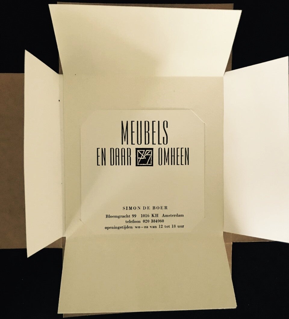 Boven: Hoe presenteert men een visitekaartje? Simon de Boer deed het zo! Het ontwerp is ontleend aan Japans vouwwerk. In het midden het monogram dat Simon de Boer ontwierp en gebruikte om werk te signeren.