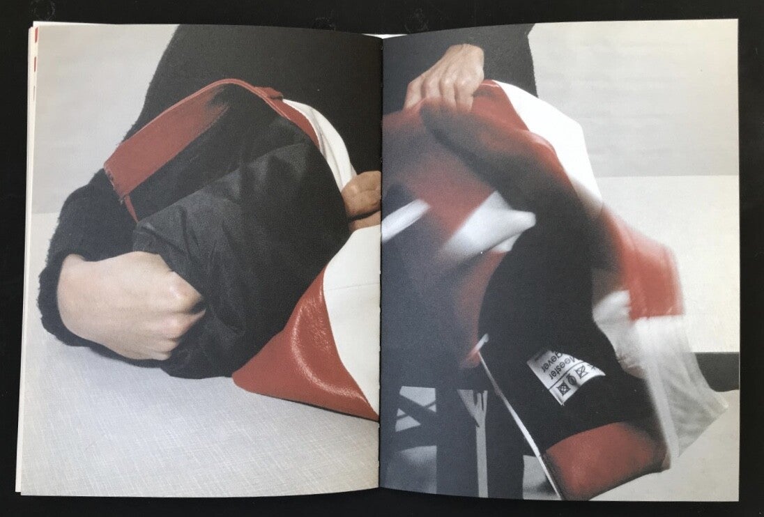 De zwarte leren stukken werden ook in nieuw rood en wit leer gemaakt dat diagonaal werd verwerkt; een broek heeft geen rechte zijnaad maar deze spiraalt rond de pijp omhoog. De rood-witte stukken hebben binnen de collectie een signaal waarde, zoals politietape dat wordt gebruikt bij ongelukken. 'Het zijn ook uitroeptekens die tussen het zwart opspringen!', zegt Simon de Boer.