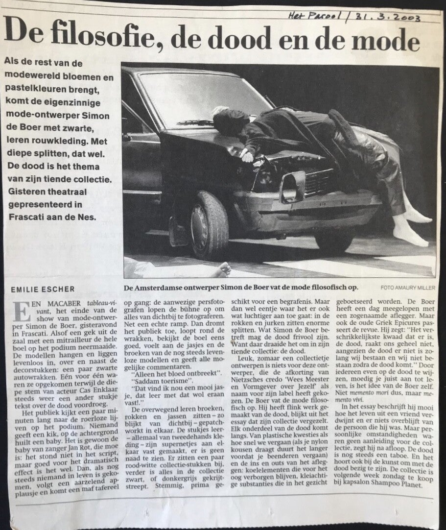 Performance: Vier autowrakken, die met de grootste moeite door zes man de grote zaal van theater Frascati in werden gedragen, en een zebrapad vormde het decor voor de performance rond de presentatie van de collectie. Het publiek zat op de tribune, de 16 modellen liepen daartussen door, bleven beneden nog even voor het publiek staan om vervolgens hun plek in te nemen onder, in, tussen of op de wrakken. Het eindbeeld was dat van een verschrikkelijk ongeluk. Na afloop begon de aanwezige pers te filmen, net als bij een echt ongeluk en precies zoals Simon de Boer het van tevoren had uitgedacht. De modellen droegen zwarte kapjes over het gezicht zodat ze het gezicht verloren, het haar was van Patrick Moonen, Shampoo Planet. Het camerawerk voor de video was van Bart van der Berg, Simon de Boer deed de montage.