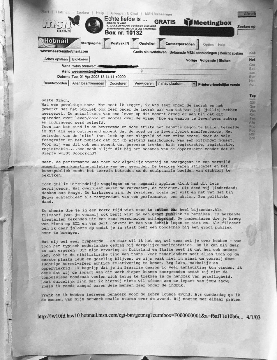 Volkskrant Magazine, 12 april 2003, Gert Jonkers. Onder: video, Dood/Wij leven! in RTL Boulevard met Fiona Hering (video nog niet verkrijgbaar).