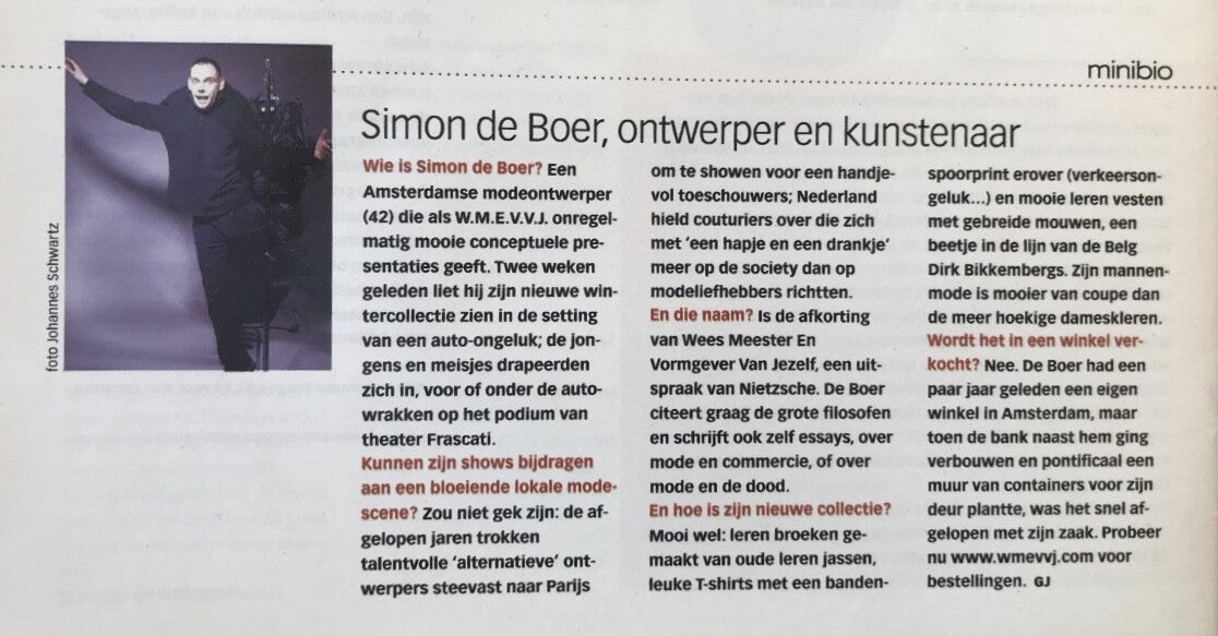 Simon de Boer werd door de Nederlandse consul in Sao Paulo uitgenodigd om de Nederlandse mode te vertegenwoordigen tijdens een Hollandse cultuurweek die werd georganiseerd i.v.m. het staatsbezoek van koningin Beatrix. Simon de Boer mocht ook twee andere ontwerpers meenemen en vroeg Bas Kosters en Roel Ruyten, die beide net afgestudeerd waren. Simon de Boer hield er een lezing en presenteerde de collectie Dood/Wij Leven! Zonder de autowrakken natuurlijk en daarom hadden de modellen heliumballonnen met W.M.E.V.V.J. letters die ze aan het einde van de show, toen iedereen voor dood op de grond ging liggen, los lieten.