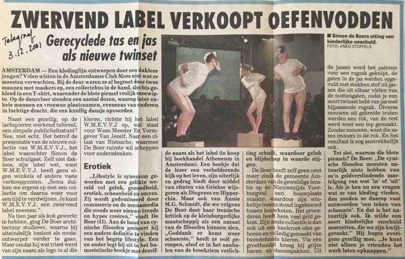 Het z.g. Plebejer T-shirt in verpakking uit de collectie Dress Reheasal Rag - die de modellen ook dragen op de foto van de Telegraaf. Gewone witte t-shirts van een nietszeggend merk werden uitgerust met vijf verschillend speldjes. De woorden van de speldjes komen haast allemaal uit de 'Kritiek van de Cynische Rede' van filosoof Peter Sloterdijk, een boek dat Simon de Boer zeer heeft beïnvloed.