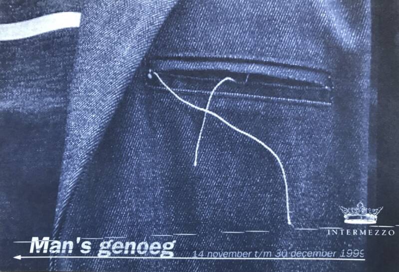 Detail van jeanscolbert met een rafelende paspelzak op de borst. Uitnodiging tentoonstelling Man's genoeg Galerie Intermezzo in Dordrecht waar een deel van de Jeanscollectie ook te zien en te koop was.