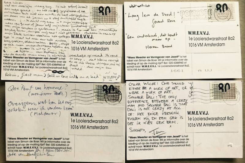 Simon de Boer ontwierp de Jeanscollectie in 1999 en voor het eerst zat er ook dameskleding in. De collectie werd gemaakt uit een rol van 100 meter Amerikaanse jeans die Simon de Boer had kunnen bemachtigen. Denim-fabrikanten hebben meestal een afname-eis van minimaal 3.000 meter, dat zou een te grote investering zijn geweest. Om toch diversiteit in de collectie te krijgen werd de stof hier en daar ook binnenstebuiten gebruikt. Ook werd de jeans aan dunne repen gescheurd en die repen werden aan elkaar gestikt en vormde zo het garen voor het breiwerk. Rokken en jasjes werden afgezet met een golvend biesje gemaakt van uitgerafelde jeans: blauw en wit want schering en inslag - wat bijvoorbeeld ook terug te zien is in de gebreide, geblokte jeanssjaal. Alle items met knopen hadden zes knopen, ook de gulpen van de jeansbroeken, al was dat behoorlijk proppen. Op elke knoop stond een letter gegraveerd: W.M.E.V.V.J.