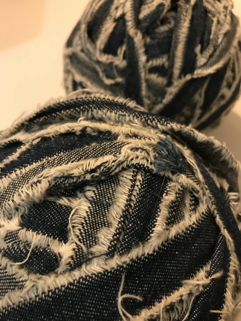 Links: Simon de Boer in een Jeans-outfit met rafelende riemlussen, een vest van gescheurde, gebreide jeans en een t-shirt met de zelfgeschreven tekst zelfs als ik stink ruik ik lekker. Rechts: Bollen van aan elkaar gestikte, gescheurde jeansstroken.