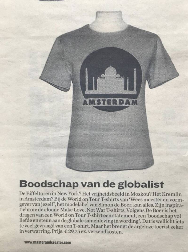 In 2006 opende Simon de Boer, in de vaart der volkeren, een webshop. Voor deze webshop ontwierp hij een aantal eenvoudige producten zoals de serie van zes T-shirts met de titel World on Tour. Omdat het project globalisering als thema had vertaalde Simon de Boer zijn label naar Be Your Own Master and Creator en kocht hij het webadres masterandcreator.com. Het T-shirt werd wereldwijd verkocht en was een redelijk succes; er waren weken dat Simon de Boer dagelijks met pakjes naar het postkantoor moest. Op de website was een fotoalbum te zien van mensen van over de hele wereld die een World on Tour-shirt droegen en zichzelf fotografeerde voor een lokaal landmark. Er werd ook een promotieclip gemaakt met de verschillende silhouetten op een song van Leonard Cohen The Great Event. Helaas is de clip verloren gegaan toen een computer de geest gaf en er geen back-up bleek te zijn.