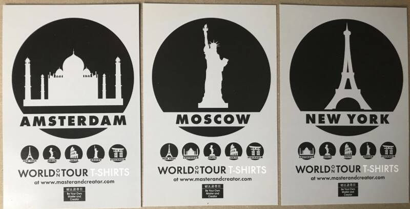 Boven: ansichtkaarten voor het project. Rechts: er werd ook een World on Tour-gathering georganiseerd voor iedereen die in Amsterdam een T-shirt kocht. De huiscocktail was de Cosmopolitan.