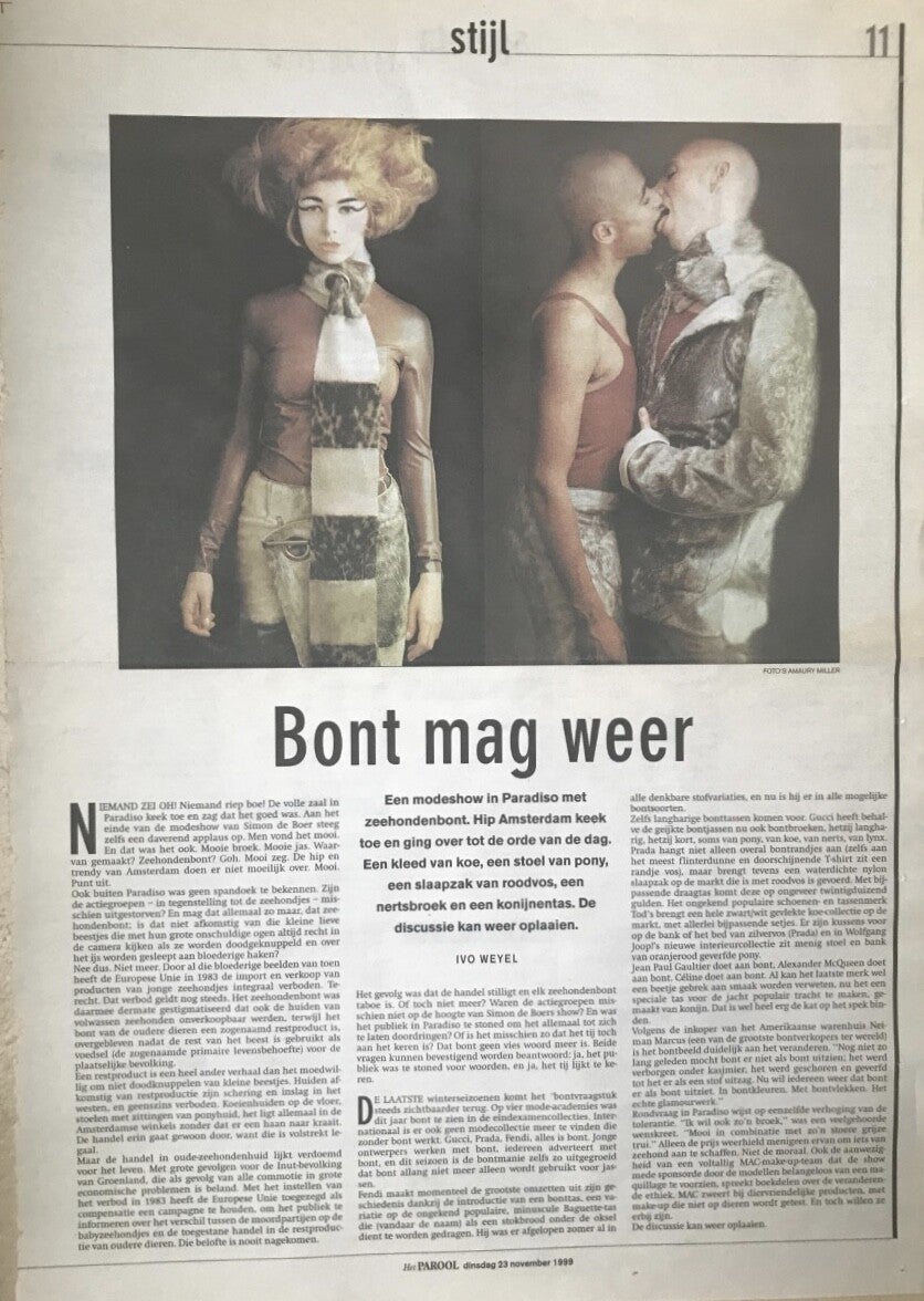 Met de symfonische presentatie van de collectie haalde Simon de Boer de voorpagina. Het Parool, 20 november 1999.
